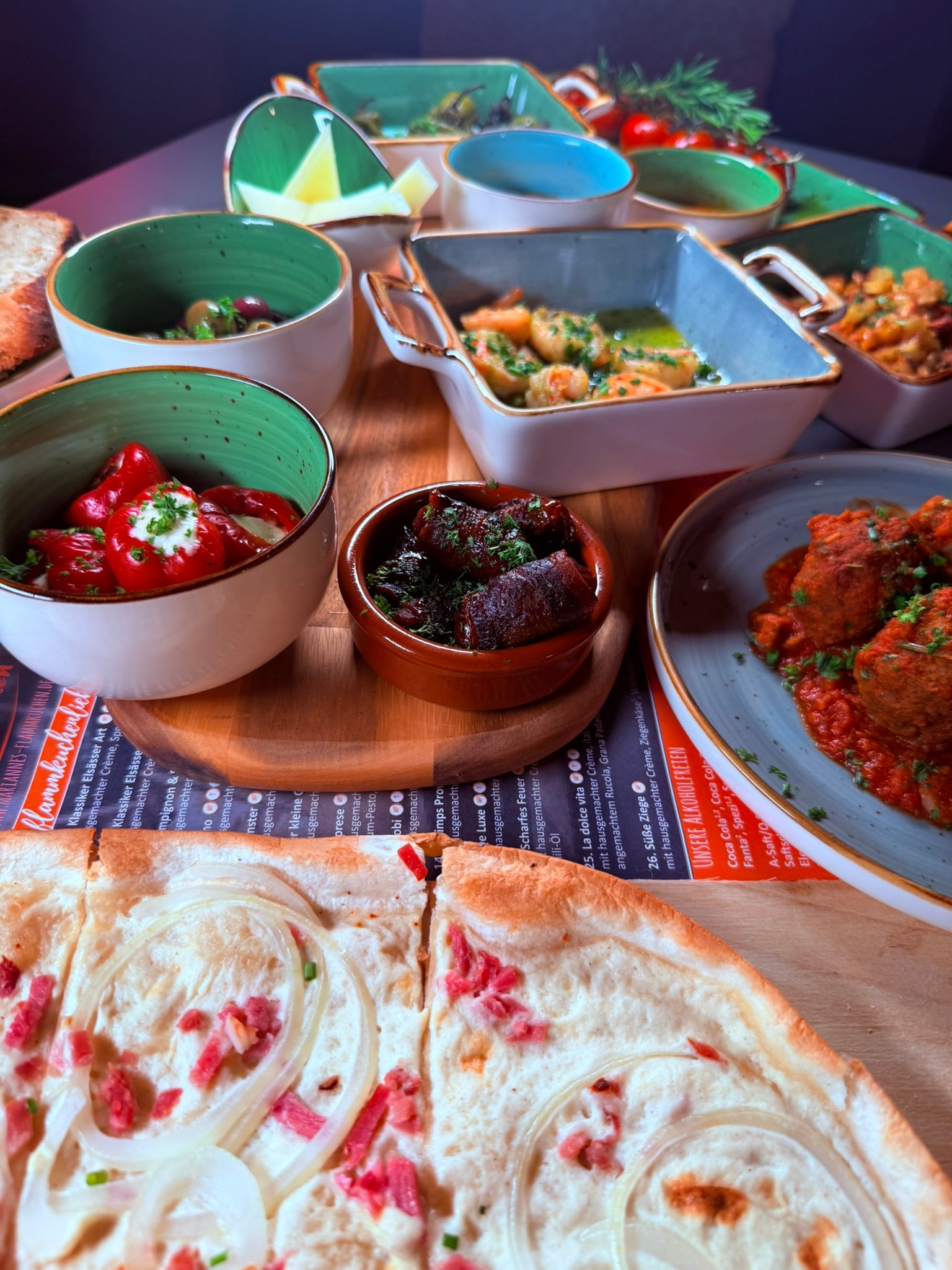 Erlebe die perfekte Fusion aus französischen Flammkuchen und spanischen Tapas! Flammkuchen & Tapas All you can eat