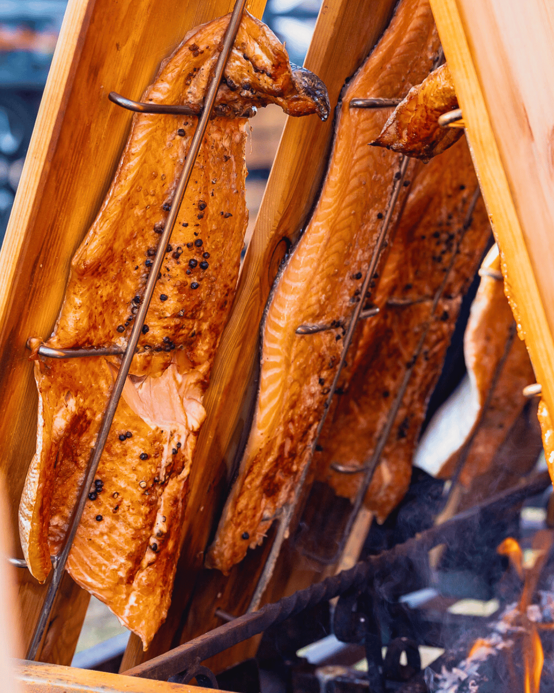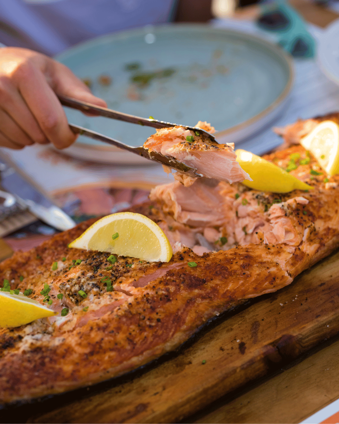 Von mediterranen Vorspeisen und köstlichen Flammkuchen bis hin zu einer über offenem Feuer gegarten Lachshälfte, direkt am Tisch serviert.