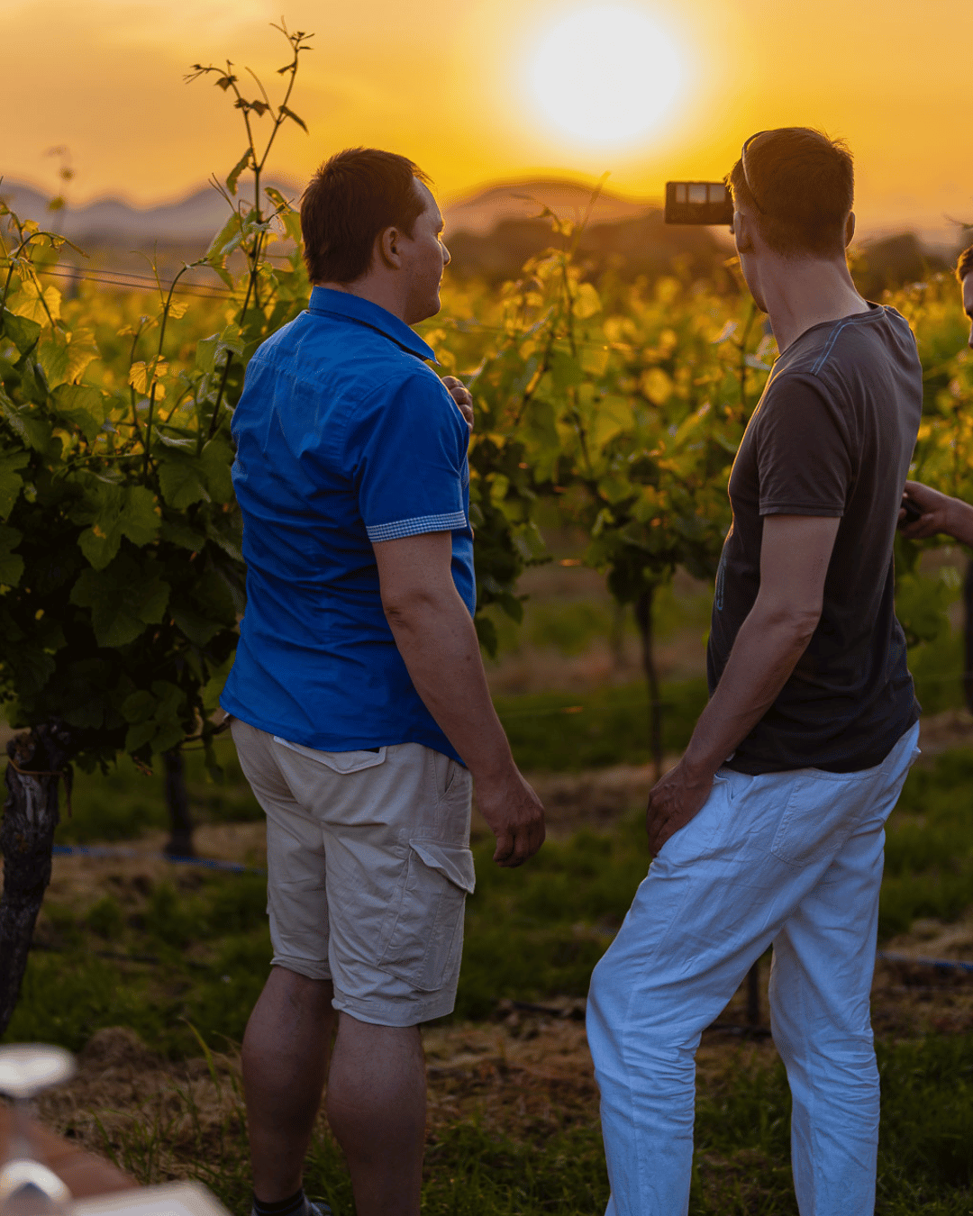 Während die Dämmerung die Weinreben in magisches Licht taucht, sorgt unser Radio-DJ für die perfekte musikalische Begleitung.